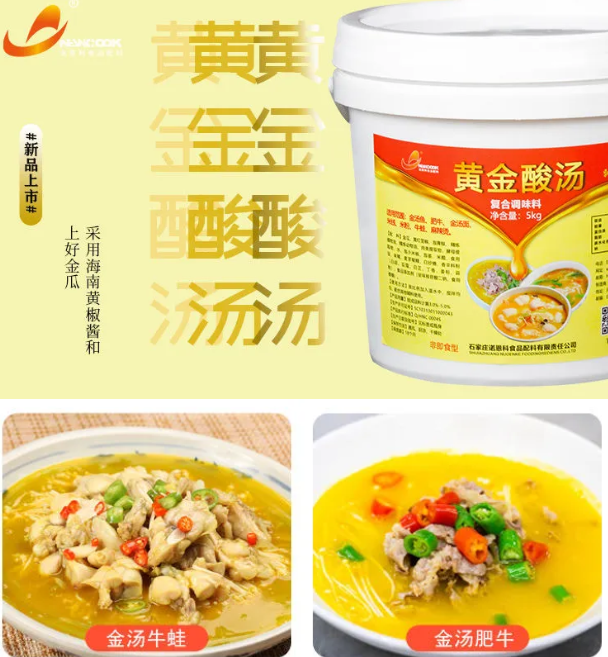 黄金酸汤以特定区域生长且完全成熟的金瓜作为原材料,以确保其颜色金黄、口感醇厚,具有保护肠胃的效果;采用产自海南的发酵黄椒酱,辣而不呛、不会上火。利用炒制熬汤工艺,不添加任何色素,真材实料、汤底浓郁、口感酸爽、回味无穷。可应用于金汤肥牛、金汤牛蛙、金汤酸菜鱼、金汤娃娃菜、金汤米线、面、麻辣烫等。