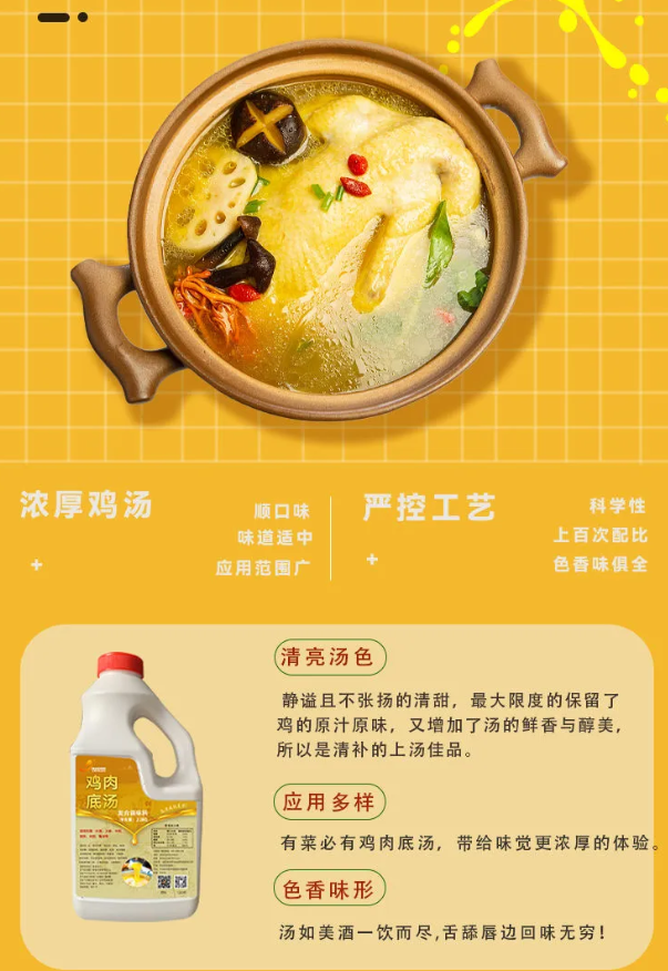 鸡肉底汤采用纯鸡肉进行蒸煮、打泥、酶解,进行美拉德反应后,加入酵母抽提物做成肉味底汤,口感上肉味浓郁、鲜度纯正、汤底醇厚,入口后回味悠长。可广泛应用于米线、汤面、火锅、麻辣烫、烤鱼、卤制品的汤底调配中。